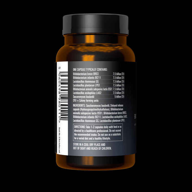 Saccharomyces boulardii, Delayed release capsule (Hydroxypropylmethylcellulose), Bifidobacterium animalis subspecies lactis BS01, Bifidobacterium breve BR03, Bifidobacterium infantis BI211, Lactobacillus acidophilus LA02, Lactobacillus rhamnosus GG, Lactobacillus plantarum LP01.