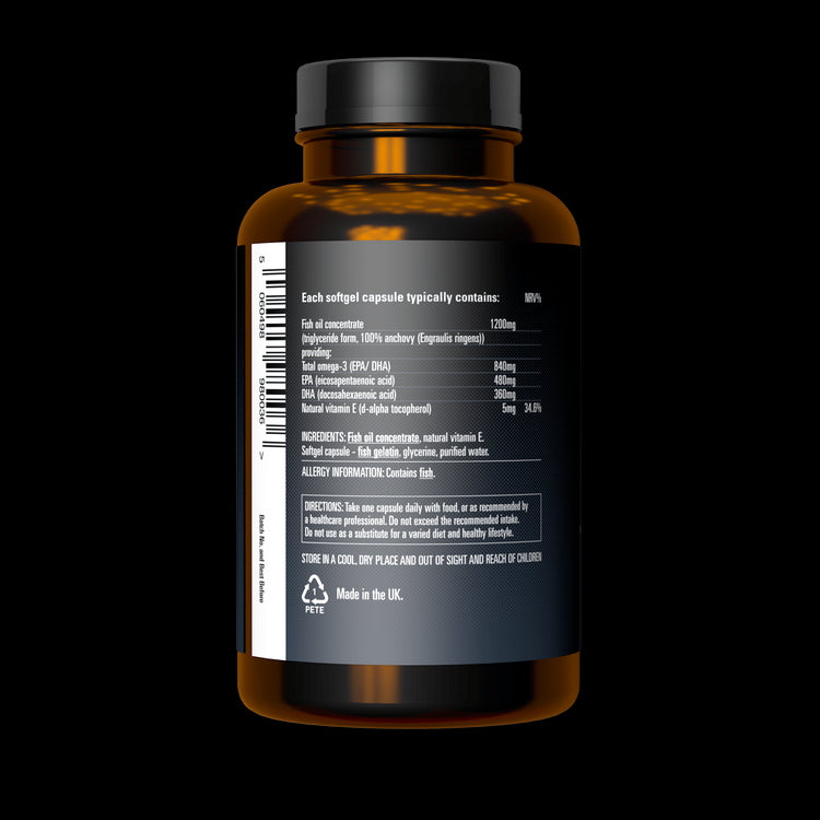 We start with 1,200mg of fresh, high-strength fish oil Omega 3, add a dash of vitamin E to preserve it naturally, and ensure it's free from any nasties. This careful process guarantees a pure and potent product for your daily health regimen.